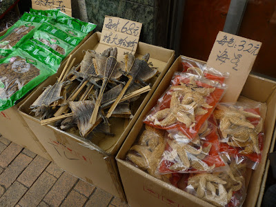 Our flight left in the afternoon, so we only had the morning free. To maximize our time, we got up early (requiring B to run out and get me a frappuccino from Starbucks: maybe 3 cocktails weren't a good idea after all!), and made our way to Sheung Wan, one of the oldest sections of the city. There we took a walking tour of streets selling traditional Chinese products, including all kinds of ginseng, deer antler, swallows' nests, live snakes (for potency), live frogs (to eat), and many other strange, unidentifiable products. We also saw the famous Hollywood Road (where high end art and antiquities are sold) and the Man Mo Temple, popular with both the police and gangsters (and apparently UPS men; we saw two coming in to worship as we were leaving). Hong Kong is still a pretty religious place (for Chinese religion), so it was interesting to experience a little bit of that.