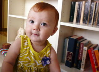 She didn't do anything startling this month, just built on her skills. So she is better at crawling, standing unassisted, and moving around in general. She also loves "talking" and will hold long conversations of babble with herself or me, for minutes at a time. It almost sounds like speech, although the only real words she has are Dada and Mama (though she seems to understand no, come here, and her name/nicknames).