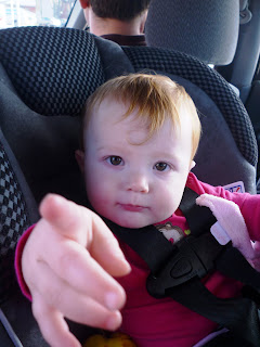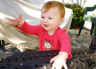 Along with the walking came a certain personality shift. While still good-tempered and cheerful, she is much more willful and active now. She knows what she wants, and whenever she is thwarted she will vehemently protest. Occasionally she will even fall to the floor shrieking and beat it with her little hands (a pre-temper tantrum perhaps?). And any interference with her goals (for instance, if I am holding her when she wants to walk) is almost painful to her, because she wants to use her new skills so much. So far it hasn't been that hard to take; I really sympathize with her intense desire to get her way and do what she wants (maybe because I still often feel that way!). So far this sympathy has prevented me from getting annoyed with her when she bursts into tears because I closed the refrigerator: we'll see how I feel later though.