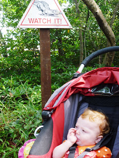 Little R had a good time practicing walking and carrying a stick around like a dog. Perhaps she thought it would help fend off crocodiles? She also enjoyed covering herself in leaf mold. The monitor lizards and other wildlife didn't seem to impress her whatsoever though: I suppose she is still too little to care.