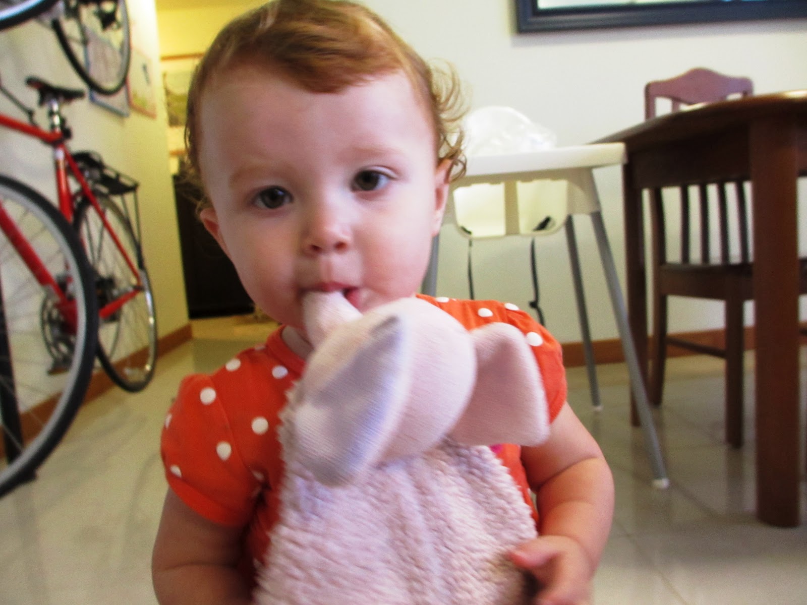 Now the elephant is again pink, instead of a faded shade of grey: but it still looks rather worn around the edges. Little R doesn't care though; she loves the elephant with all her heart. Her new favorite activity is to carry around the elephant by putting its trunk in her mouth and clamping down. This leaves her hands free for other forms of mischief or destruction.