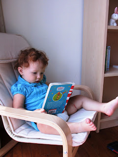 R's very favorite thing to do these days is to climb into her baby Poang, sit down, and spend time reading some of her (many) books. She usually takes several books into the chair with her, so that she will have enough reading material.