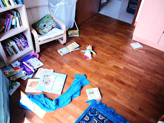 Mostly she doesn't play with her toys though. She likes playing with books, CDs/DVDs (we have a lot of pirated ones from when we lived in China so I let her play with them), clothes, various household objects...Most of the mess is just her generally creating chaos out of order, and even if I threw out all her toys it wouldn't help that much, unless I also removed everything else and left her in a barren, empty room. (And didn't feed her: each meal results in yet another cleaning, of her and the surrounding area). Maybe Ginny is just much neater!