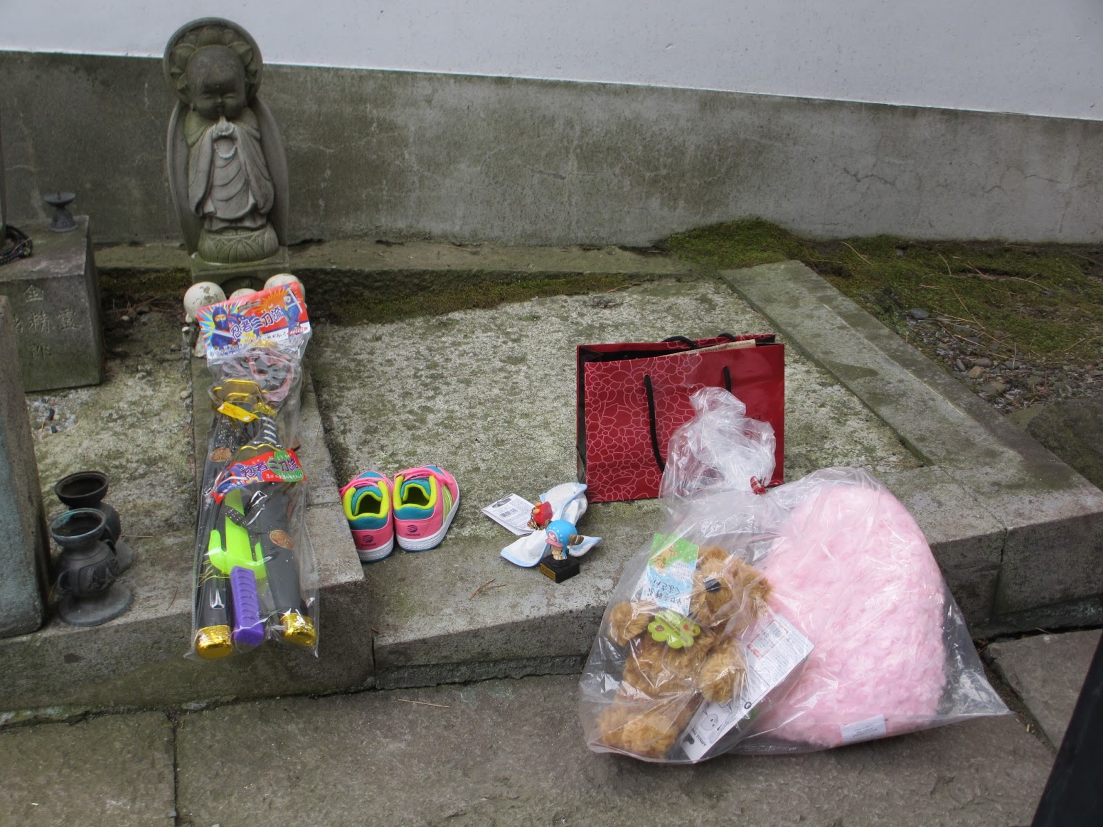 | Statues here commemorated dead children: I cried to see this little shrine because the shoes were just about R's size |