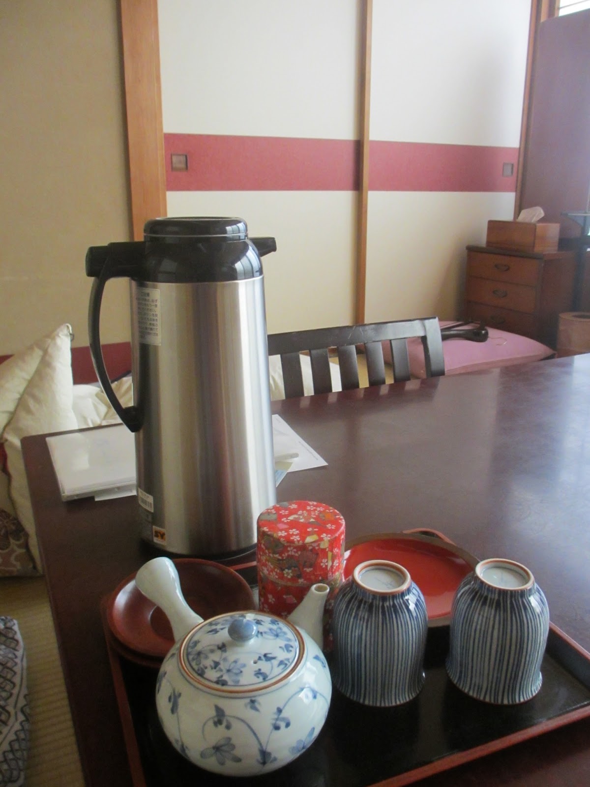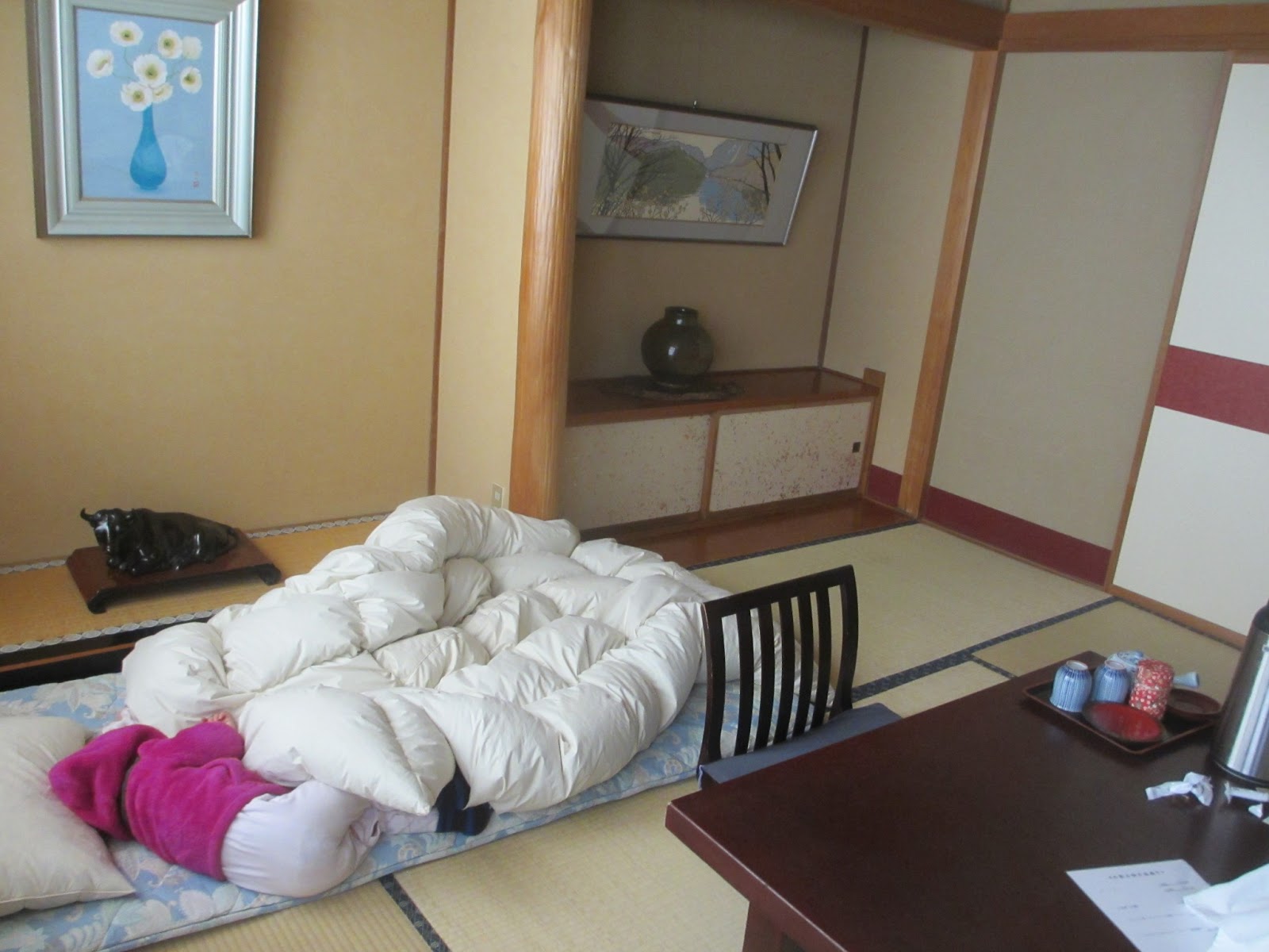 This means that your room will be covered in tatami (straw) mats, with minimal furniture. During the day, a low table and chairs are placed on the floor (generally with hot tea and cookies/snacks included, to greet you upon arrival), and you use the room as a sitting area; at night, the furniture is packed away and futons are put out, making the space a bedroom (in traditional Japanese style, you sleep on the floor, which is surprisingly comfortable). The inn staff is very sneaky/adept at this conversion process, so it seems to happen by magic.