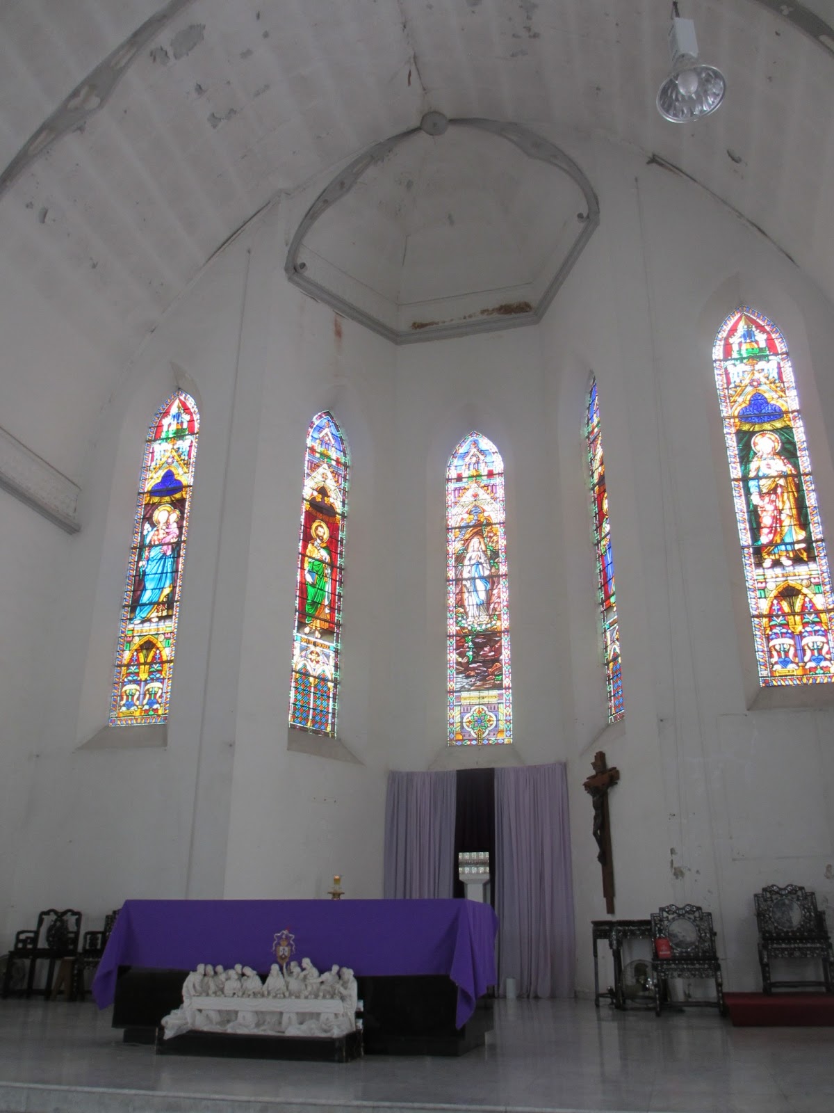 | Church interior. All the crucifixes creeped R out (they are horribly gruesome if you think about it: a man being slowly tortured to death). She liked the Virgin Mary though. |