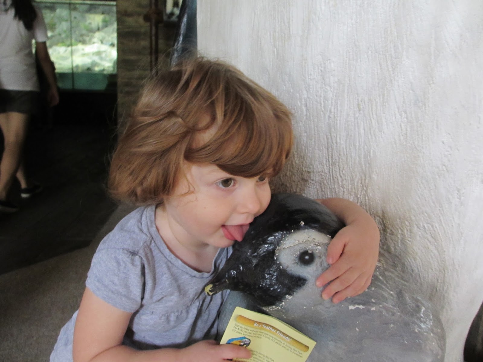 R was fondly hugging the baby penguin statue: totally cute!: but as soon as I aimed the camera she decided to take it to the next level. Stopped her right away of course but really what good does that do, since it's not as if germs require a long time for transmission? Why R??